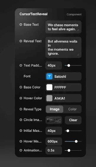 Cursor Text Reveal is an immersive, interactive component for Framer that transforms ordinary text into a cinematic hover experience.