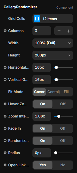A fully customizable image grid with random ordering, adjustable gaps, hover zoom, fade-in loading, null-image support, and per-image links. Great for products, portfolios, etc.