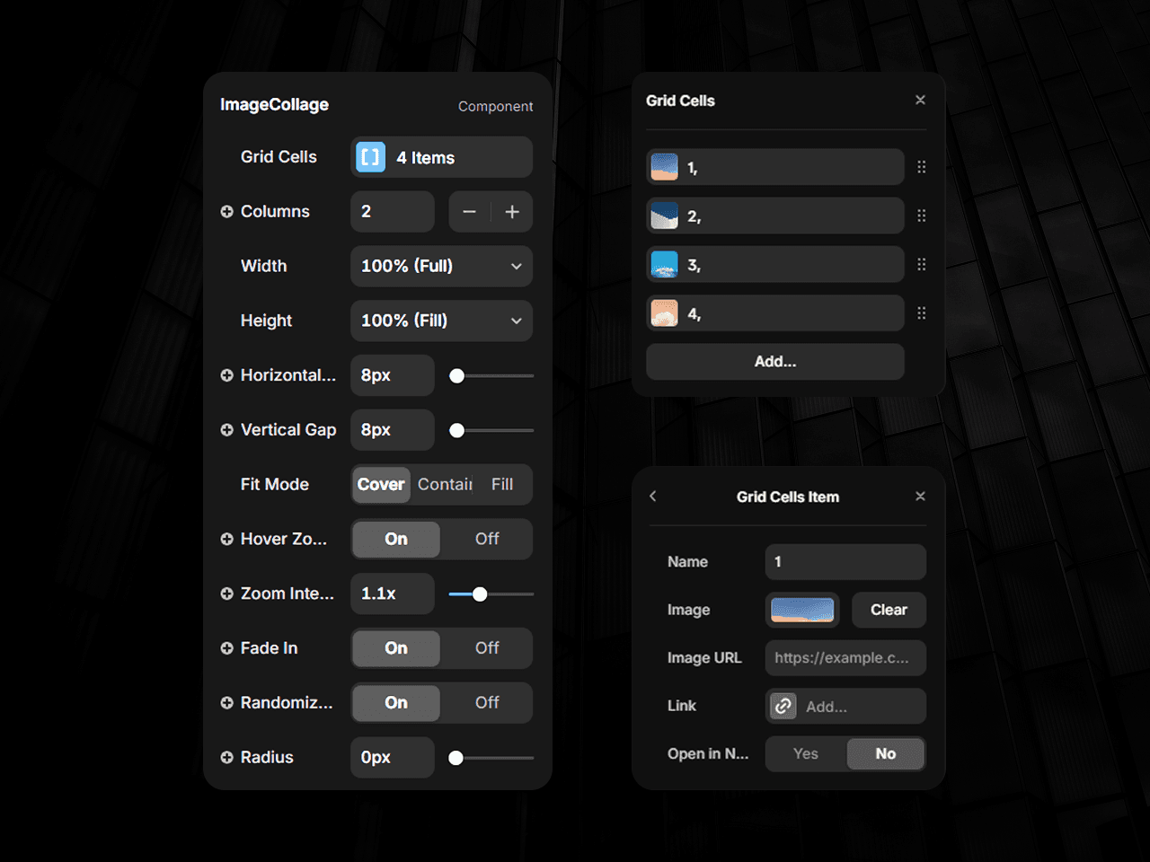 A fully customizable image grid with random ordering, adjustable gaps, hover zoom, fade-in loading, null-image support, and per-image links. Great for product showcases, portfolios, and collage-style layouts.